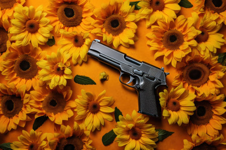 A gun laying on top of a bunch of yellow flowers. AI generative image.
