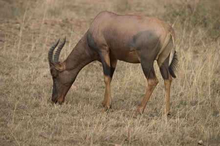A Topi grazes on the Savannah. Serengeti National Park, Tanzania