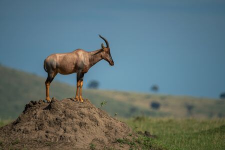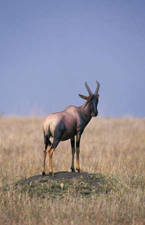 Topi antelope standing on termite hill in Masai mara reserve kenya