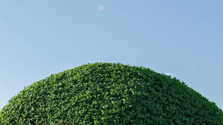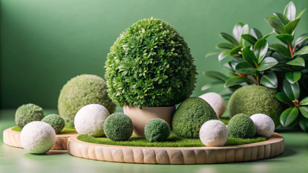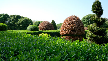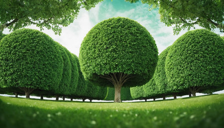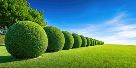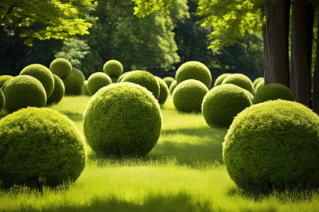the idyllic scene of round hedges, showcasing vibrant shades of green, contemporary aesthetics to convey the tranquility and beauty of the meticulously arranged hedges
