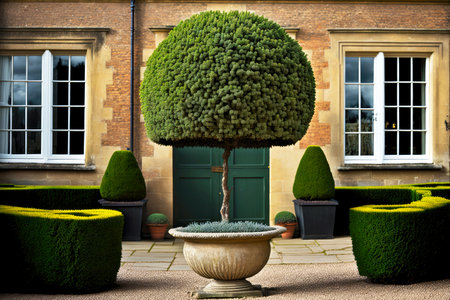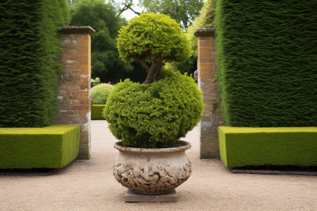 a beautifully sculpted topiary in a large pot, created with generative ai