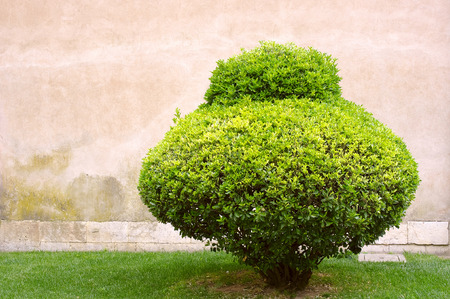 Decorative green bush on grass meadow in spring. Landscape and gardening