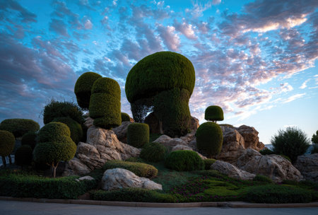 A landscape features meticulously shaped topiary plants set amongst large, textured boulders. The scene presents a variety of green hues from the rounded bushes and shrubs under a cloudy sky. The composition emphasizes natural forms with a contrast of organic and geometric shapes. This image might be suitable for editorial or commercial applications.