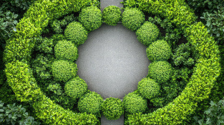 A captivating aerial view of a meticulously designed garden with symmetrical green shrubs surrounding a smooth pathway, inviting relaxation and serenity.