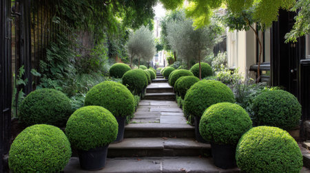 A serene garden pathway featuring lush circular topiary shrubs leads through vibrant greenery, offering a tranquil escape filled with natural light and beauty.