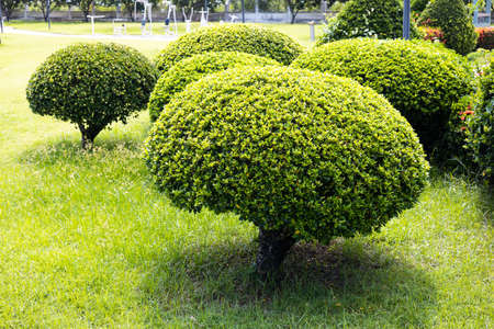 A view of a low shrub that has been trimmed into a circular shape, planted on the grass at a public park in rural Thailand.