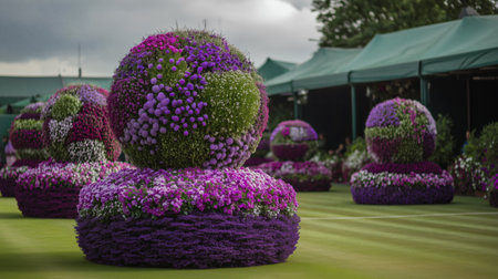 A beautiful display of vibrant floral topiaries, shaped into abstract forms and adorned with purple, pink, and green flowers, stands on a manicured lawn with green tents in the background, embodying the iconic floral elegance of Wimbledon.
