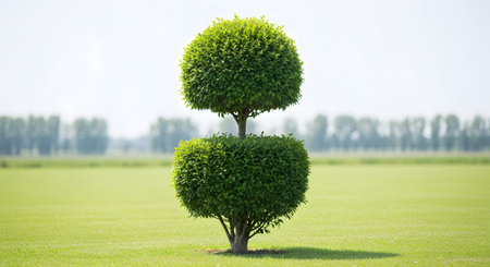 A perfectly sculpted topiary bush, shaped into two distinct spheres, stands as a solitary feature in the center of a vast, immaculate green lawn. The minimalist composition highlights the art of landscaping, symmetry, and manicured nature against a soft, out-of-focus background.