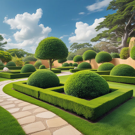 A meticulously maintained garden features perfectly sculpted green topiaries, a winding stone pathway, and a bright blue sky with fluffy clouds.