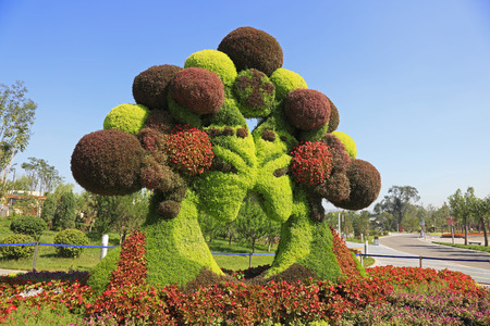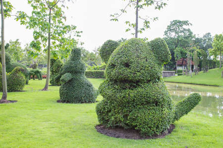Green topiary rabbit sculpture decorating a beautiful park on a sunny day