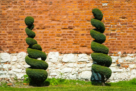 Garden with two spiral shaped green decorative bushes, shaped bushes