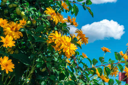 Close up, Mexican sunflower blooming (Tithonia diversifolia) or Dok Bua Tong in blue sky background, Yellow flower.