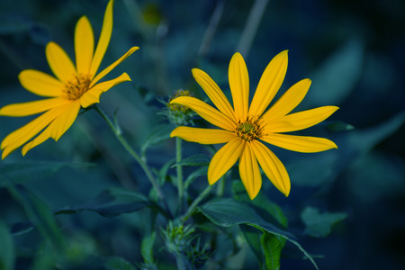 Beautiful yellow jerusalem artichoke flowers bloom on bushes with green leaves in the summer twilight. Nature.