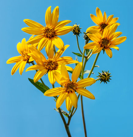 Jerusalem Artichoke yellow flowers against a blue sky. Outdoors.