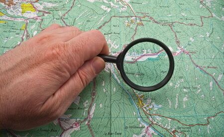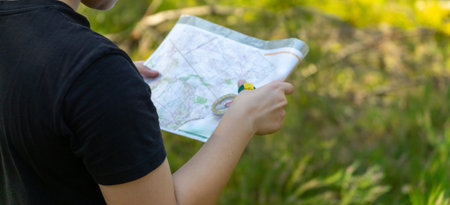 Anonymous person looking the travel route on a map in the mountain. Routes, excursions and mountain trails through nature in summer. Concept of exploring and live adventures traveling in nature.