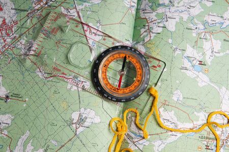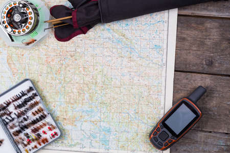 intend to fishing journey with fly-fishing tackles and gps navigator on paper map background