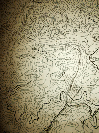 Close up view of a topographic map highlighting detailed terrain features and landmarks