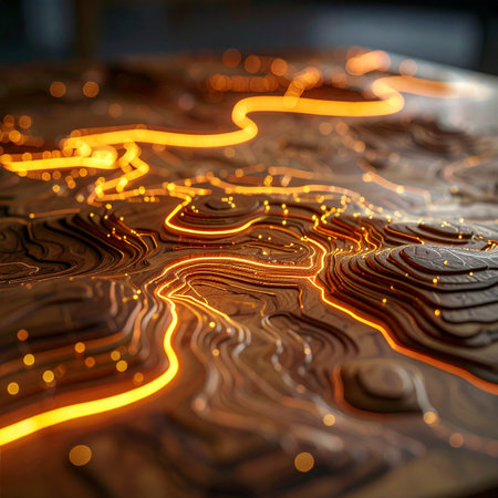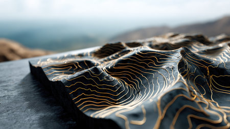This image showcases a meticulously crafted topographic model featuring intricate golden contours on a dark surface, highlighting landscape variations and depth.