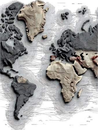 Artistic 3D relief world map presenting unique patterns and colors, featuring detailed topography and a creative design ideal for educational and decorative purposes.