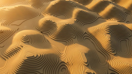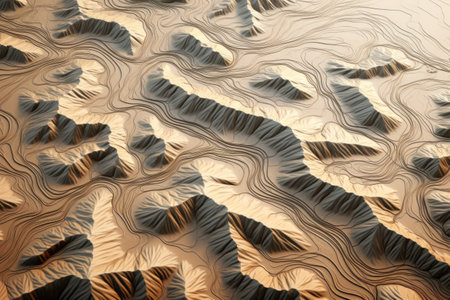 Abstract topographic map contour lines forming a desert landscape with sand dunes and shadows.