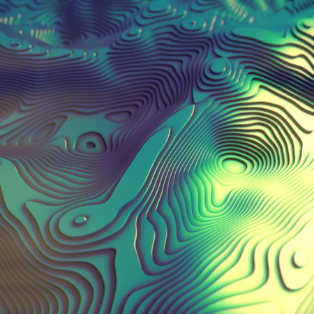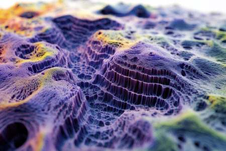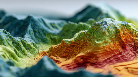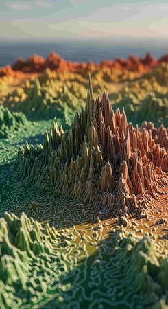 Detailed abstract portrayal of unique topographical shapes showcasing vibrant colors and intricate patterns.