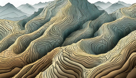 A visually striking abstract representation of topographical relief featuring intricate contour lines and layered textures in earthy tones, perfect for creative projects.