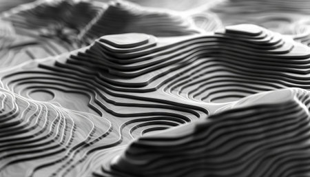 A monochrome illustration depicting an artistic topographic map. The detailed contoured lines create an intricate representation of a landscape, evoking a sense of exploration and topography.
