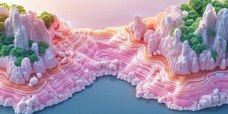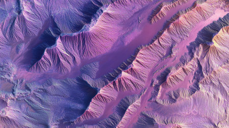 This captivating abstract image showcases a topographic view of colorful layered terrain, featuring vivid pink, purple, and blue hues that create a striking visual.