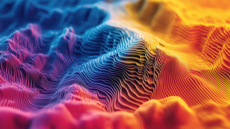 This abstract 3D terrain model showcases colorful contours and intricate layers, representing various topographical features and landscapes. Ideal for visual design.