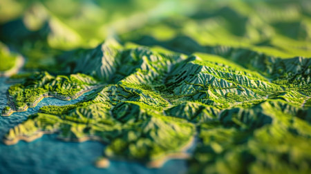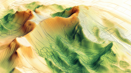 A stunning abstract representation of a topographic landscape featuring green and gold tones. This image highlights the intricate patterns and textures of mountains and forests.