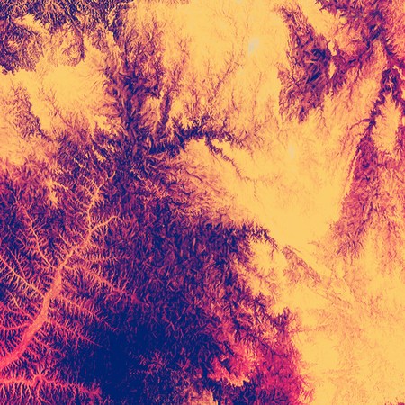 Abstract landscape illustration mimicking mountainous terrain with blue rivers