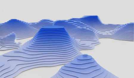 Topographic 3D map of dangerous mountain terrain. Contour lines on a topographic map. Studying geography of area: hills, mountains and plains. Cartography concept, mountain hiking, 3d illustration