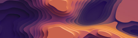 Wide 3D panorama Landscape Paper Cut style. Curved shapes with sunset color gradients. Abstract geometric lines background illustration design for cover, design, book, poster, flyer