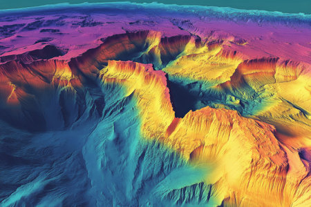 This vibrant image features intricate topographic details with stunning colors. The rich textures and layered formations evoke a sense of exploration and natural beauty.
