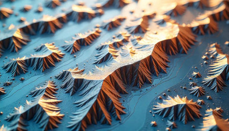 This abstract image showcases a topographic view of mountainous terrain, featuring intricate textures and shadows highlighted by blue and golden colors.