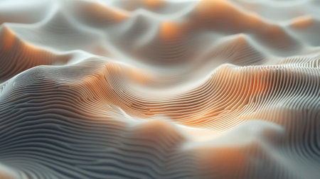 This abstract digital artwork showcases a three-dimensional representation of orange and white mountain ranges, highlighting unique textures and elevations. Ideal for modern design projects.