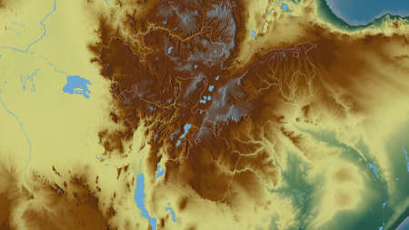 Oromia, state of Ethiopia. Colored relief with lakes and rivers. Shape outlined against its country area. 3D rendering