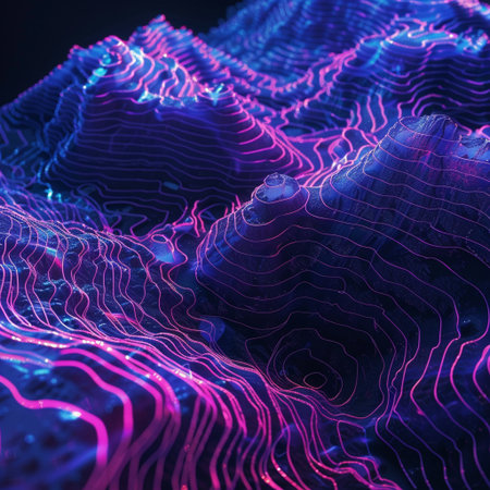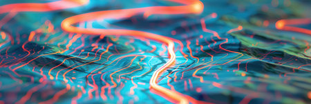 This captivating abstract image showcases a digital landscape with flowing lights and vibrant colors, beautifully representing natural terrain and topography.