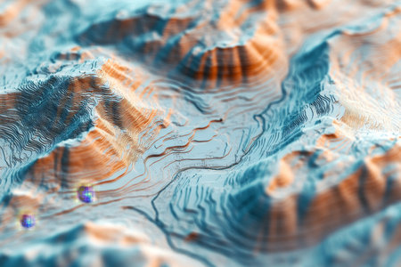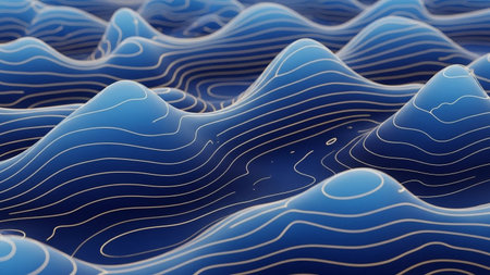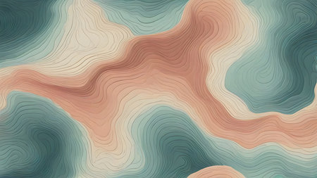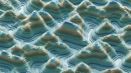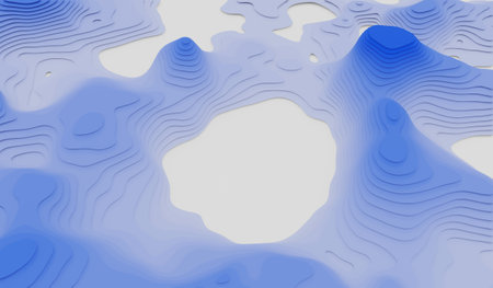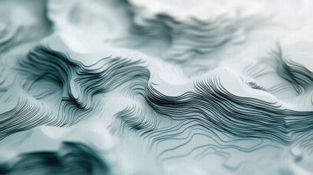 An abstract illustration shows a detailed topographic surface, rendered with layered contour lines. The image showcases variations in elevation and terrain, with a gradient of blue and beige hues suggesting depth and dimension. This design could be used in various applications, including scientific visualizations, educational materials, and design projects.