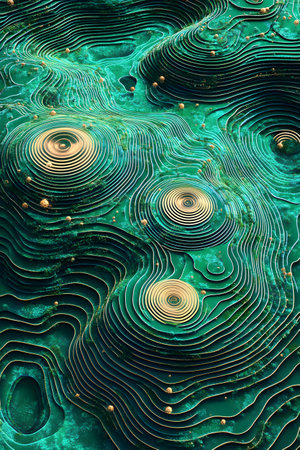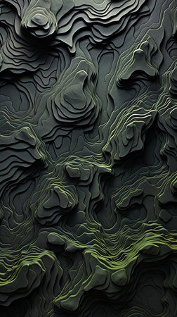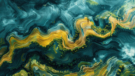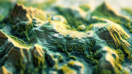 A stunning abstract representation of a topographic landscape featuring green and gold tones. This image highlights the intricate patterns and textures of mountains and forests.