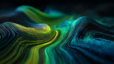 Abstract Wavy Terrain: Flowing Green and Blue Lines Against a Dark Background
