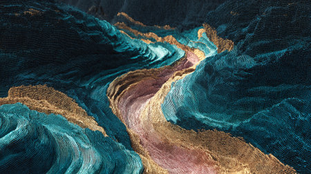 This stunning abstract landscape showcases layered textures and vibrant colors, resembling waves and geological formations, ideal for modern artistic themes.