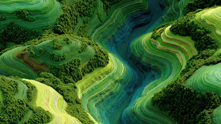 Terraced green landscape with river flowing through hills showcasing eco friendly nature and digital mapping for sustainable economy.