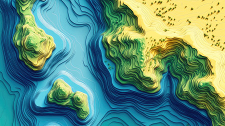 Vibrant topographic map showcasing a coastal landscape with stunning elevation contours in shades of blue, green, and yellow, perfect for design projects.