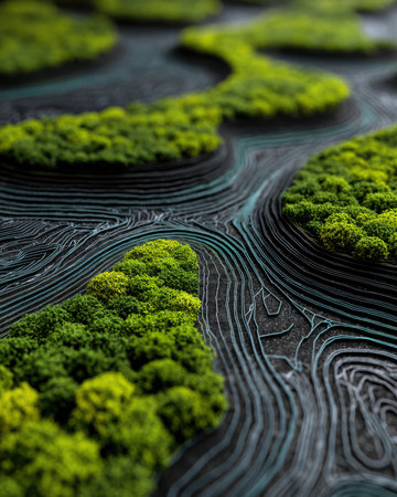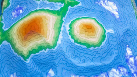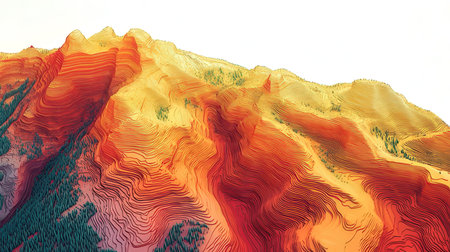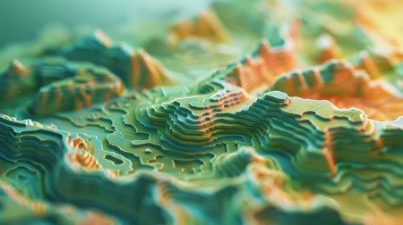 An abstract illustration presents a topographic map with layered contours and varied colors. The image showcases a three-dimensional effect, using shades of green, orange, and brown, suggesting a landscape. This art piece could be suitable for design projects, educational materials, or presentations related to geography and cartography.