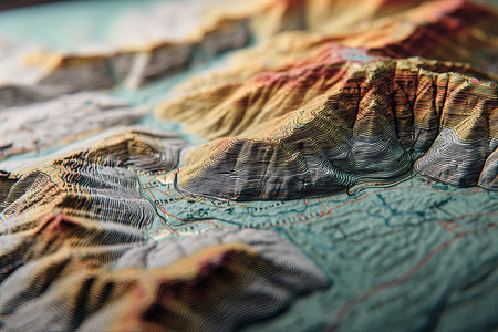 This image depicts a detailed topographic relief map showcasing a mountain range, featuring intricate contours and layers that represent elevation and terrain.