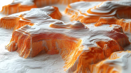 This abstract digital artwork showcases a three-dimensional representation of orange and white mountain ranges, highlighting unique textures and elevations. Ideal for modern design projects.