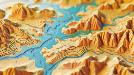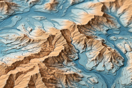 Topographic relief map showcases mountains and rivers, highlighting cartography and topography. Ai Generated