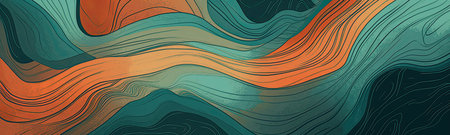 Chaotic organic morphing abstract fluid art background. Free flowing smooth teal, orange colors and golden lines and waves wide long banner in vintage style. AI Generative content