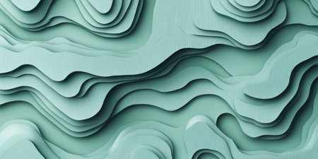 Abstract layered topography with vibrant green to blue gradient, depicting a flowing valley and undulating terrain contours. modern digital illustration.